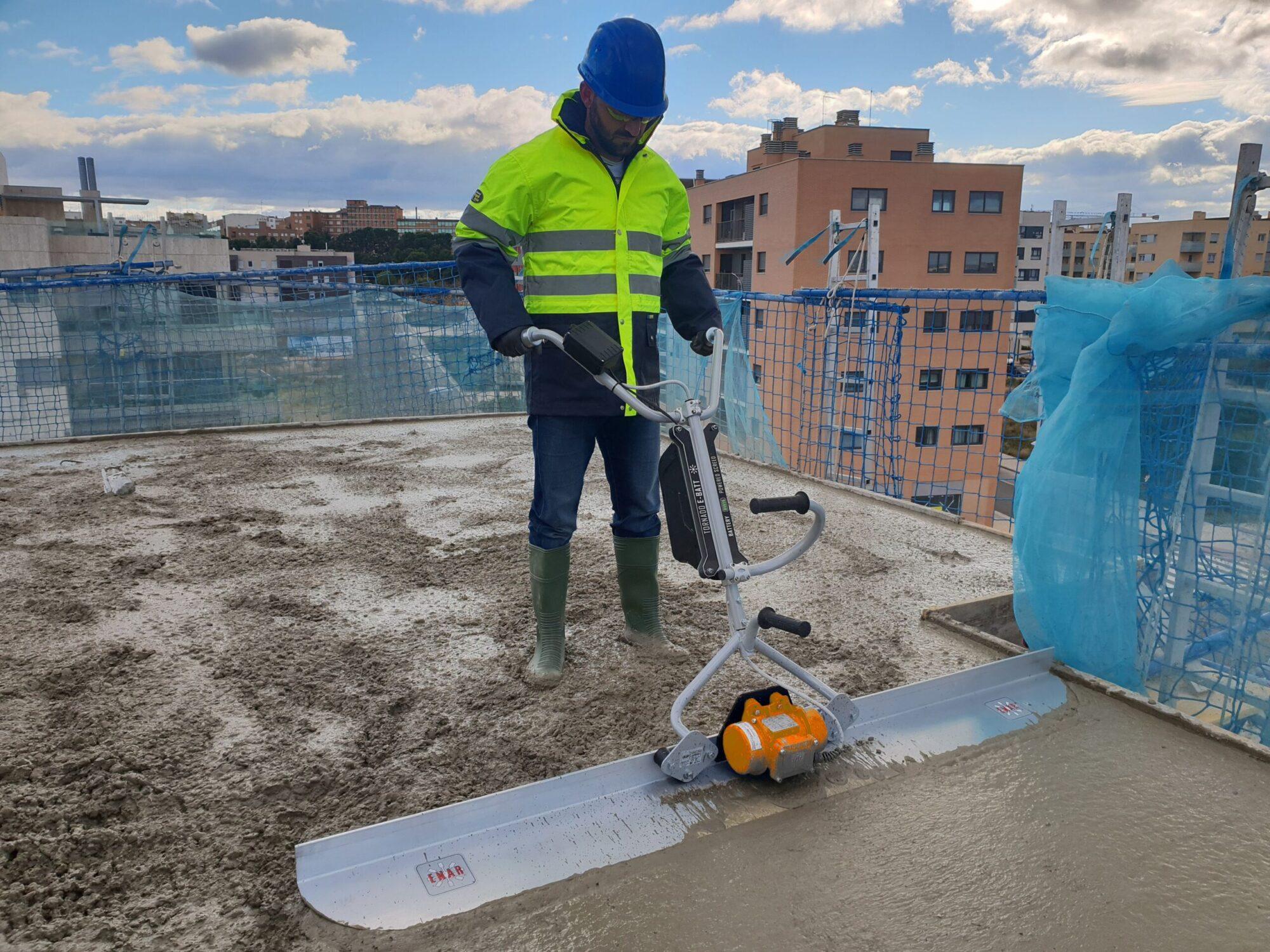 The TORNADO vibrating screed combines optimal compacting of all types of concretes with the technology of a battery-powered electric motor that avoids the use of cables. It has a lower noise level and does not generate waste. The handles have excellent vibration isolation due to the dampers of the frame and to the innovative VAS system, which reduces vibrations received by the operator by 50%.