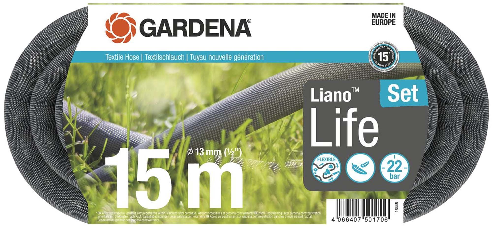 Το σετ υφασμάτινου λάστιχου Liano™ Life 15 m της GARDENA είναι έτοιμο για άμεση χρήση σε μικρούς κήπους. Το υφασμάτινο λάστιχο Liano™ Life έχει διάμετρο 13 mm (1/2″) και είναι ιδανικό για άρδευση μικρής και μεσαίας διάρκειας. Εκτός από το Liano™ Life μήκους 15 m, το σετ περιλαμβάνει τα προσυναρμολογημένα εξαρτήματα του Original GARDENA System: Ταχυσύνδεσμος Liano™ και Ταχυσύνδεσμος Stop Liano™, ένα Ακροφύσιο καθαρισμού και δύο ρακόρ. Το ένα ράκορ διαθέτει ενσωματωμένη συστολή, ώστε να μπορείτε να συνδέετε το λάστιχο σε βρύσες τριών διαφορετικών μεγεθών. Ο εύκαμπτος εσωτερικός σωλήνας από PVC και το πρωτοποριακό εξωτερικό περίβλημα από ανθεκτικό ύφασμα εξασφαλίζουν εξαιρετικά επιτυχημένη απόδοση. Κατά το πότισμα του κήπου ή την εκτέλεση εργασιών καθαρισμού, η ελαστικότητα του λάστιχου ποτίσματος σάς βοηθά, καθώς το Liano™ Life δεν τσακίζει και καθοδηγείται άνετα γύρω από εμπόδια. Το υφασμάτινο λάστιχο ποτίσματος είναι κατά 50% ελαφρύτερο από τα συμβατικά λάστιχα από PVC. Σε συνδυασμό με την ευχάριστη αίσθηση, το τράβηγμα και η μετακίνηση του λάστιχου γίνεται εύκολα ακόμα και για μεγάλες χρονικές περιόδους. Η υψηλή ευκαμψία είναι χρήσιμη κατά την αποθήκευση του υφασμάτινου λάστιχου, καθώς χωράει άνετα στον διαθέσιμο χώρο φύλαξης, για παράδειγμα πάνω σε ένα ράφι ή στη γωνία του γκαράζ. Μπορείτε να φυλάσσετε το Liano™ Life στον κήπο σε όλη της διάρκεια του έτους, καθώς είναι ανθεκτικό στην υπεριώδη ακτινοβολία και τον παγετό. Έχει πίεση θραύσης στα 22 bar. Το υφασμάτινο λάστιχο Liano™ Life δεν περιέχει επιβλαβείς ουσίες, όπως φθαλικές ενώσεις (<0,1%), κάδμιο, μόλυβδο και βάριο (<0,1%). Αφού γίνει καταχώρηση του προϊόντος στη διεύθυνση gardena.com/registration εντός 3 μηνών από την αγορά, η GARDENA σας παρέχει 15ετή εγγύηση κατασκευαστή για αυτό το ποιοτικό λάστιχο ποτίσματος, το οποίο κατασκευάζεται στην Ευρώπη. Κατασκευασμένο για ακραίες συνθήκες. Σχεδιασμένο για καθημερινή χρήση. Υφασμάτινα Λάστιχα Liano™.