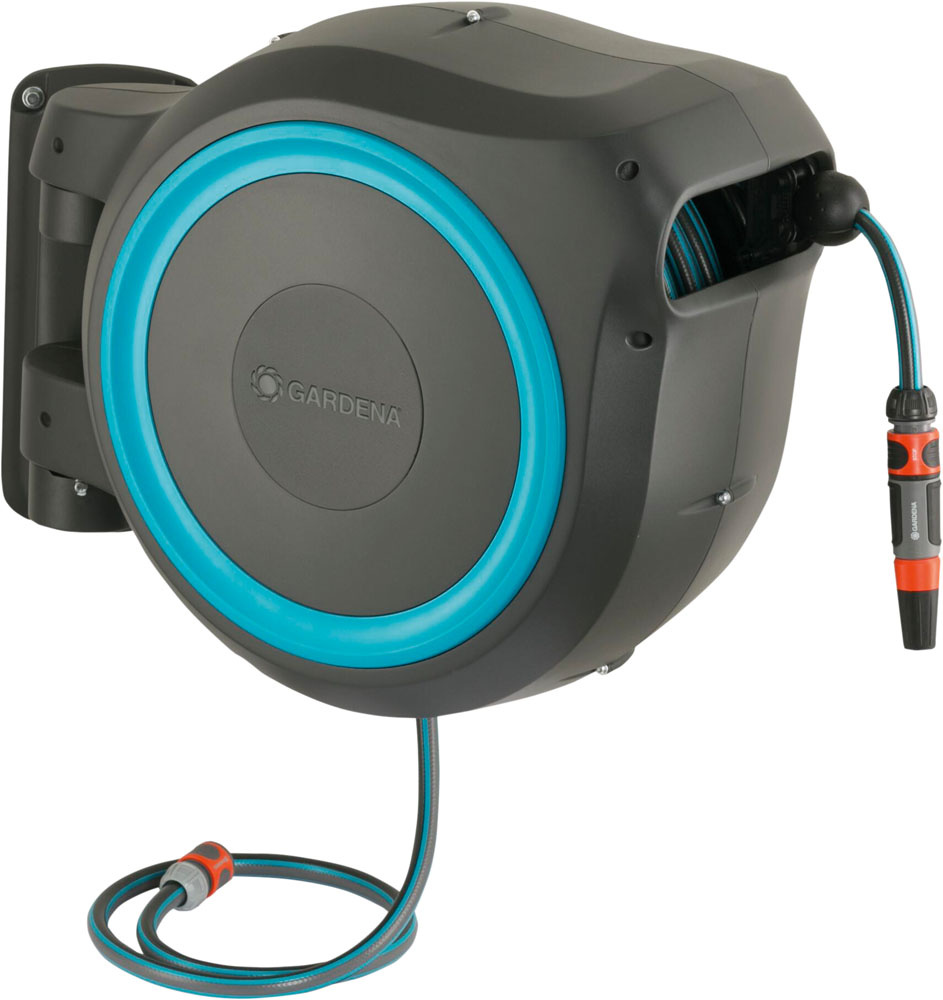 Τυλίγει το λάστιχο αντί για εσάς. Τοποθετείται στον τοίχο και μπορεί να περιστραφεί κατά 180°. Μετά τη χρήση το λάστιχο μπορεί να κουμπώσει σε ενσωματωμένο ρακόρ ώστε να μη στάζει.