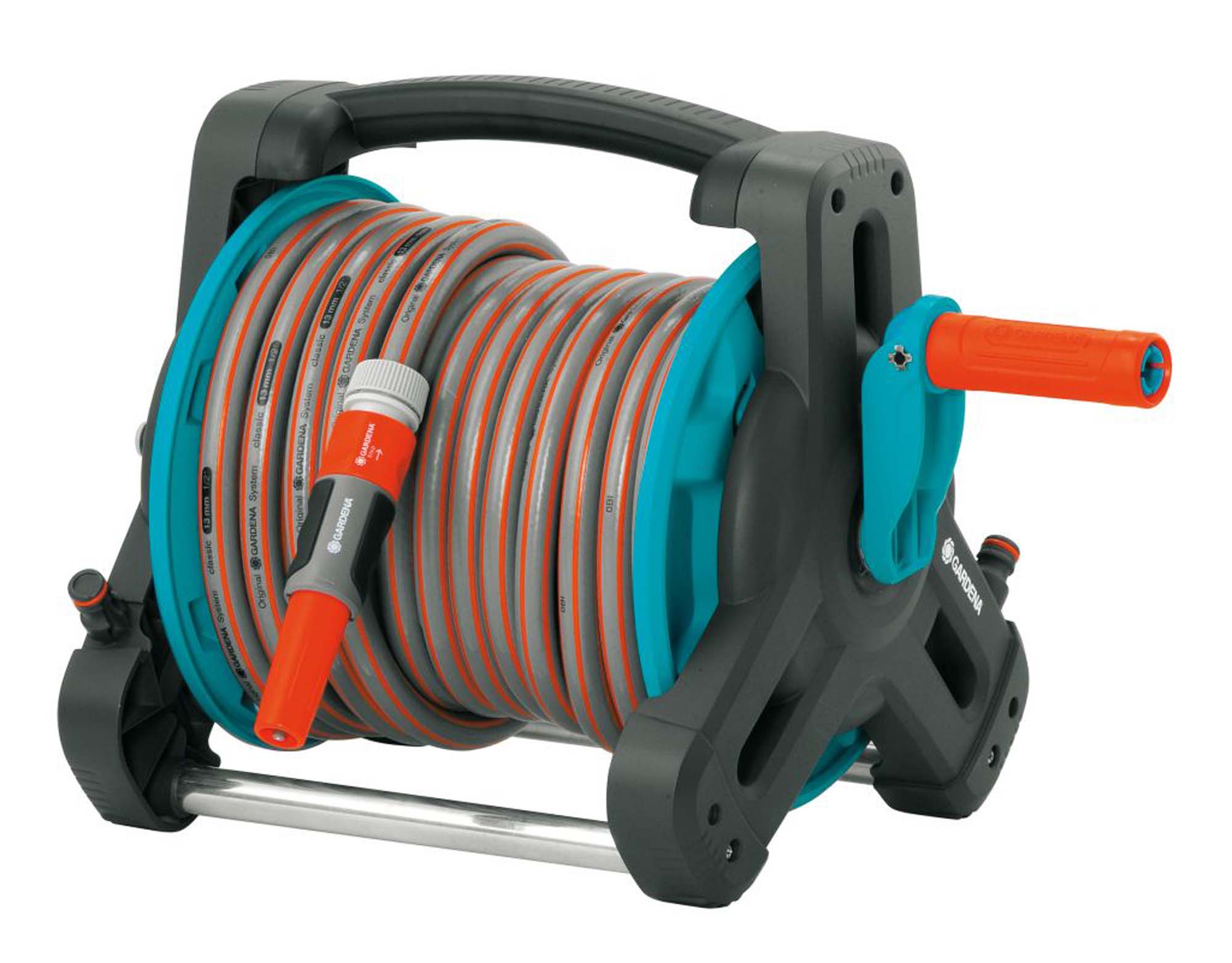 Ευέλικτο και συμπαγές Σετ Καρούλι Λάστιχου 10 Classic με Λάστιχο 10Μ GARDENA. Με μικρό βάρος, μεταφέρεται εύκολα και προστατεύει το λάστιχο κατά την αποθήκευσή του. Το σετ είναι πλήρως συναρμολογημένο και περιλαμβάνει ένα Καρούλι Λάστιχου, ένα Λάστιχο Classic 10 m διαμέτρου 13 mm (1/2″) και όλα τα απαραίτητα εξαρτήματα του συστήματος GARDENA: τρεις Ταχυσυνδέσμους Standard (Κωδ. πρ. 915), δύο Ρακόρ (Κωδ. πρ. 900 και 902), ένα Ταχυσύνδεσμο Stop (Κωδ. πρ. 913), μια Συστολή (Κωδ. πρ. 5305) και ένα ρυθμιζόμενο Ακροφύσιο ψεκασμού Classic (Κωδ. πρ. 8114). Επομένως, είναι ιδανικό για πολύ μικρούς κήπους, αίθρια ή μπαλκόνια. Χάρη στην εργονομική λαβή, μπορεί επίσης να μεταφερθεί άνετα και να χρησιμοποιηθεί οπουδήποτε. Διαθέτει μανιβέλα ελεύθερης κίνησης για εύκολο χειρισμό του καρουλιού. Μπορείτε επίσης να αναδιπλώσετε τη μανιβέλα. Έτσι, το καρούλι αποθηκεύεται σε ελάχιστο χώρο. Το Καρούλι Λάστιχου έχει τριγωνικά πλευρικά τμήματα και χαμηλό κέντρο βάρους. Αυτή η δομή το καθιστά εξαιρετικά σταθερό, ώστε να μην ανατρέπεται εύκολα. Με όλα αυτά τα χαρακτηριστικά, το πότισμα γίνεται πιο διασκεδαστικό.